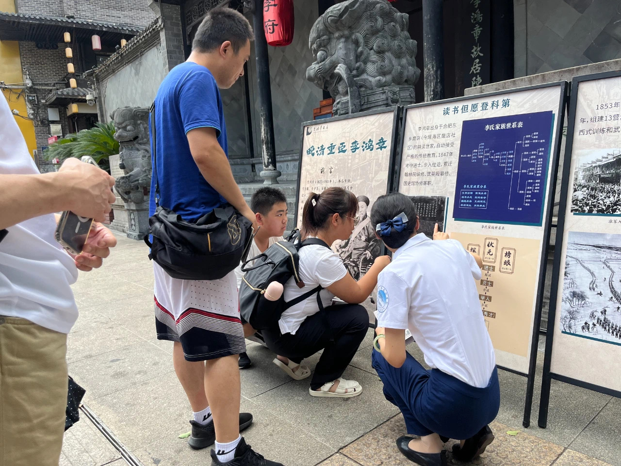 为满足观众们的参观需求,我馆将馆内展览以流动展板的形式呈现在陈列馆大门东侧,展板文字详尽、图片丰富,内容涵盖《晚清重臣李鸿章》、李鸿章故居及李鸿章享堂介绍等。我馆讲解员佩戴着“人人都是迎客松”标志,用通俗易懂的语言为现场观众带来一场场文化宣讲。观众们时而在展板前驻足观看,时而细听讲解,我馆工作人员还送上导览图、宣传手册,提供旅游咨询,传播文明理念。
