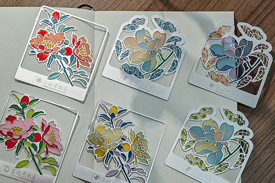 “透光书签冰箱贴”以合肥独特的城市文化为灵感,选用合肥市树广玉兰与市花石榴花为创作元素。设计师通过二次原创简化图案,将花卉的灵动与优雅巧妙呈现。采用金属镂空与透明漆工艺结合的方式,使书签在阳光下焕发如彩绘玻璃般的光芒。