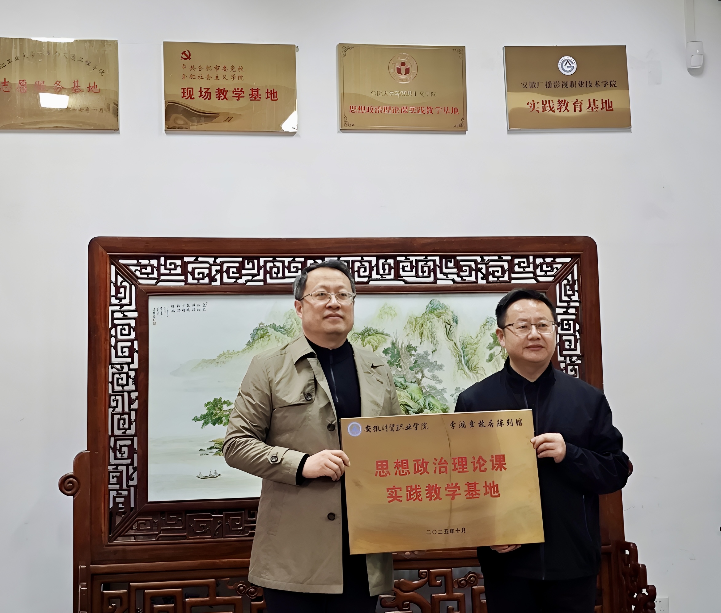 安徽财贸职业学院马克思主义学院院长张少兵、李鸿章故居陈列馆馆长吴胜及双方代表出席仪式。仪式上,双方就思政课实践教学创新、馆校共建合作等方面深入交流,达成合作共识,并签署共建协议。随后,双方共同为“思想政治理论课实践教学基地”揭牌。