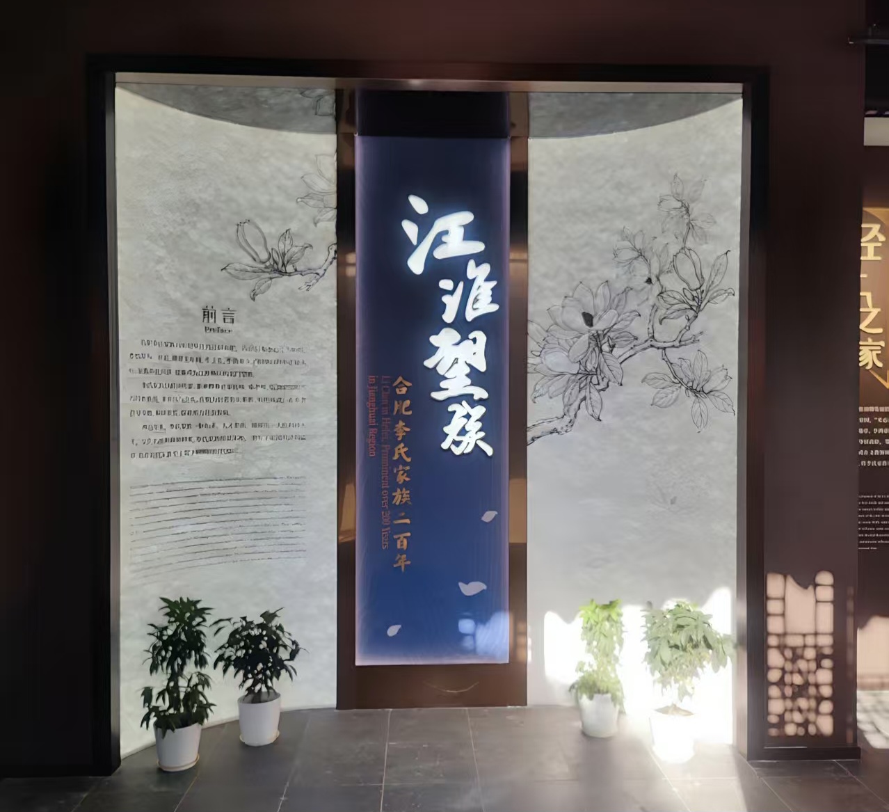 “江淮望族——合肥李氏家族二百年”展览,以“家族故事”为叙事主线,精心设计 “耕读传家”、“经世之家”、“世泽绵长”三大陈列单元,集中展示合肥李氏家族渊源、兴盛发展以及回报桑梓的历史。展览形式新颖、内容丰富,特色鲜明:一是形式上大胆创新,选用了合肥市树广玉兰作为核心视觉元素,象征家族的根脉和枝繁叶茂,揭示了一个家族与一座城市同辉的深厚情感和历史延续性;二是空间布局上突出层次感,做到空间叙事与建筑相呼应;三是展示手段多元化,综合运用图文、场景、模型以及多媒体互动等方式,让文物真正“活起来”;四是展览内容丰详实,增加了一批珍贵的实物展品,如清廷赐予李母的圣旨碑拓片、李经述的《澹园日记》、李经方的《安徽全省铁路图说》等,每一件展品都承载着这个家族的记忆与传承。