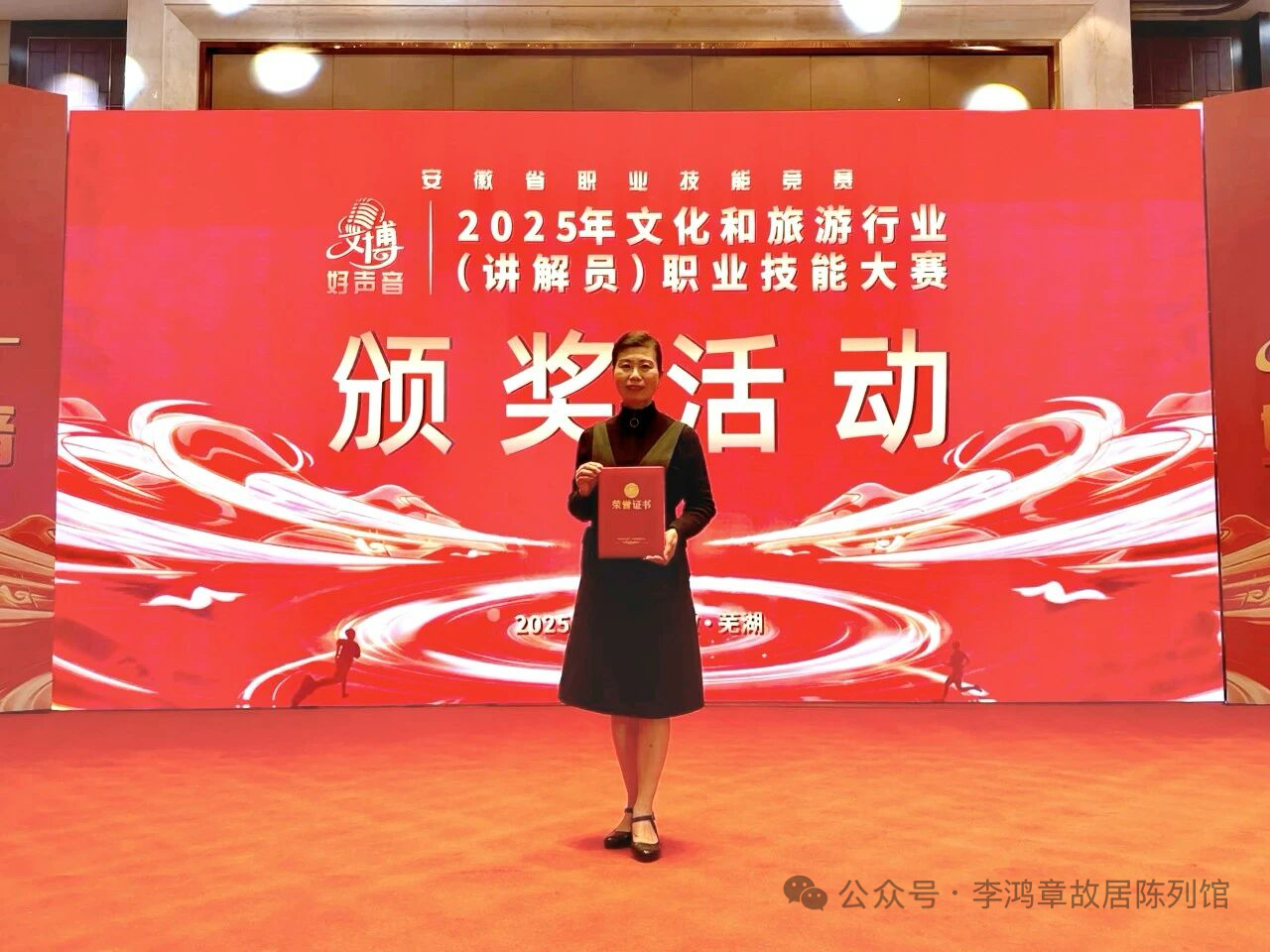 2025年12月16日至19日,由安徽省文化和旅游厅、安徽省人力资源和社会保障厅、安徽省总工会、安徽省文物局共同举办的安徽省职业技能竞赛“文博好声音”2025年全省文化和旅游行业(讲解员)职业技能大赛完美落幕。本次大赛由省文物局主办,分专业组、志愿组两大赛道,全省文博场馆选手同台竞技,比拼讲解专业能力与文化素养。我馆志愿者邹彤凭借优异表现,斩获志愿组三等奖。